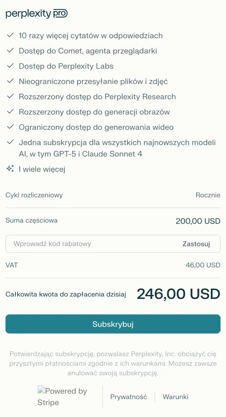 Przy wyborze dostępu dożywotniego kod na Perplexity Pro ( i Comet) na rok za darmo.
