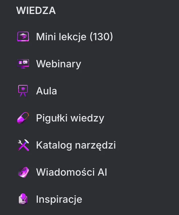 Przestrzeń wiedzy, w której są wszystkie lekcje ułożone chronologicznie, szybkie pigułki wiedzy, lista narzędzi, aktualne wiadomości, ale również moje materiały biznesowe o tym jak prowadzę swój biznes, a także inspiracje znalezione w sieci.