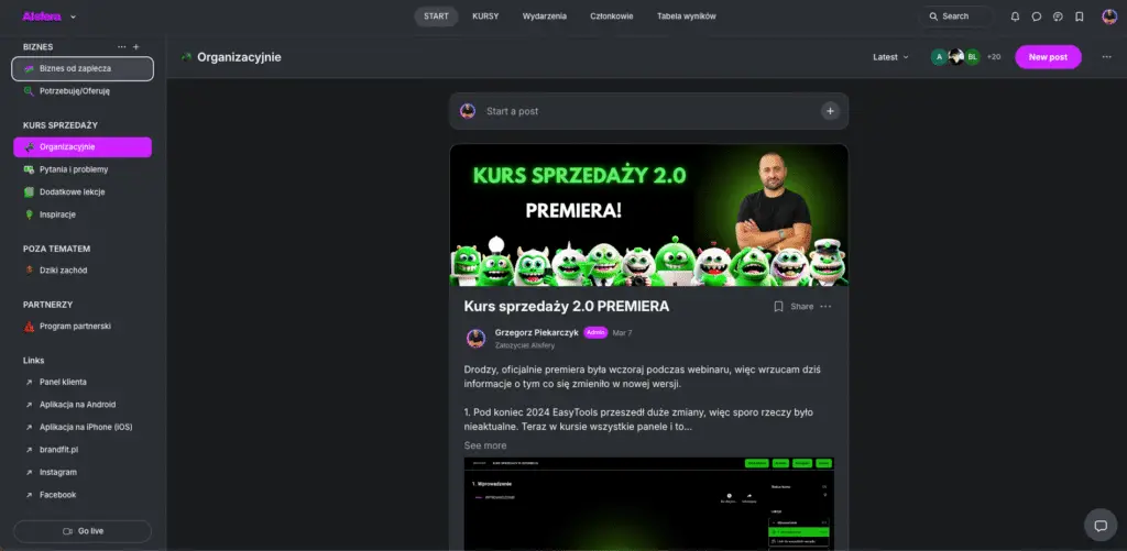Osoby z kursu sprzedaży otrzymuja dostęp do mojej platformy społecznościowej, do przestrzeni związanej z kursem. Tam znajdują się ogłoszenia, aktualizacje i możliwość zadawania pytań. Nie giniesz wśród tysięcy klientów, tylko masz bezpośredni kontakt ze mną oraz z innymi z kursu.